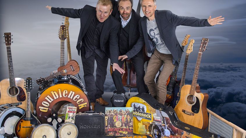 Mit Gitarre, mehrstimmigem Gesang, Kontrabass, Mandoline, Mundharmonika und „speziellen“ Drums, spielt sich doubleneck durch ein ausgewähltes Repertoire der letzten 60 Jahre.