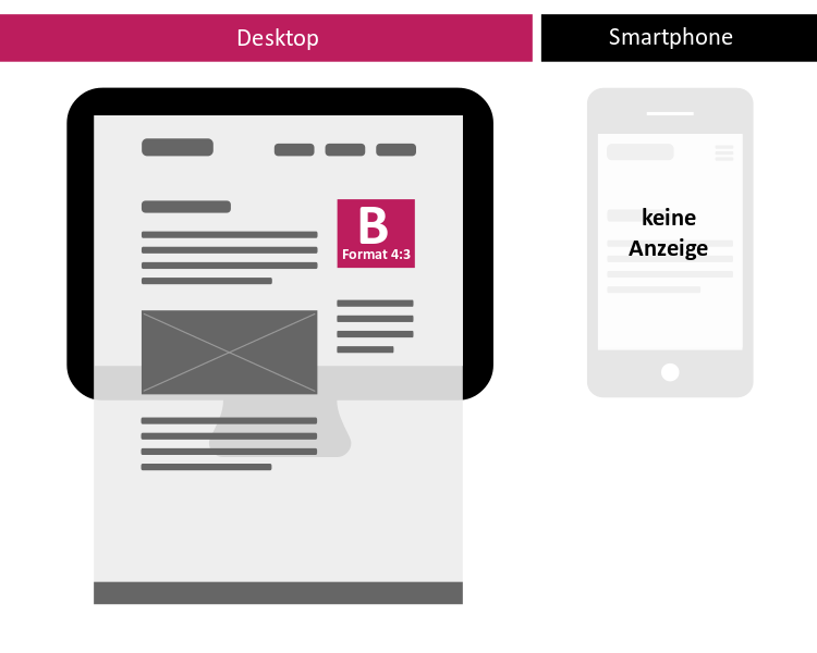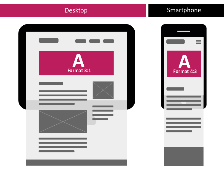 Die Inhalte werden auf dem Desktop breit und in Smartphones schmal und untereinander dargestellt. Dies führt je nach Gerät zu unterschiedlichen Anzeigeformaten der Banner. Die Banner im Desktop sind je nach Zone sehr gross und äusserst Präsent, und auf dem Smartphone werden diese dann einheitlich für alle Zonen im Format 4:3 über die gesamte Contentbreite dargestellt.